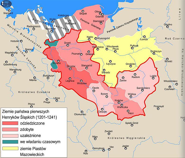 Země slezských Jindřichů - červeně zděděné, světle červeně dobyté, růžově závislé, zeleně dočasná vláda, žlutě země mazovských Piastovců, zdroj: Techpedia.pl